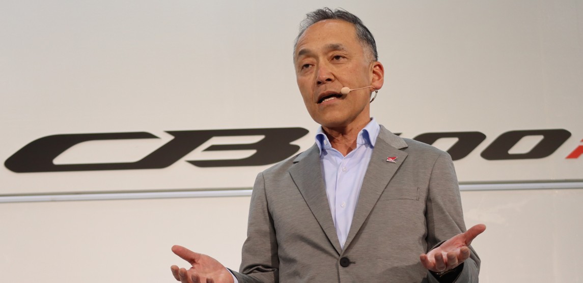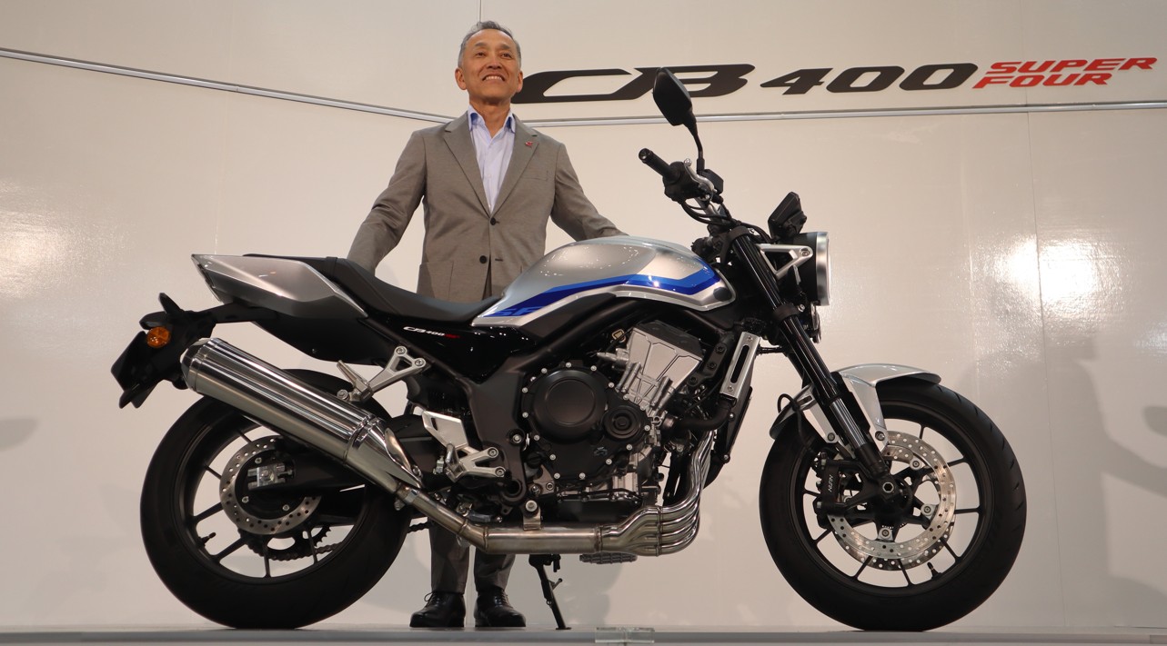 「CB400 SUPER FOUR E-Clutch Concept」を披露するホンダモーターサイクルジャパンの室岡・社長