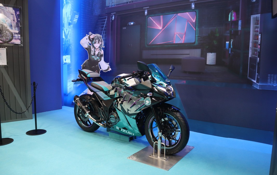 「ホロライブプロダクション」所属のバーチャルYouTuberである輪堂千速さんとの共同でデザインしたコラボレーションバイク「GSX250R Chihaya Remix」を特別にまたがり可能な状態で展示し、人気を集めた。
