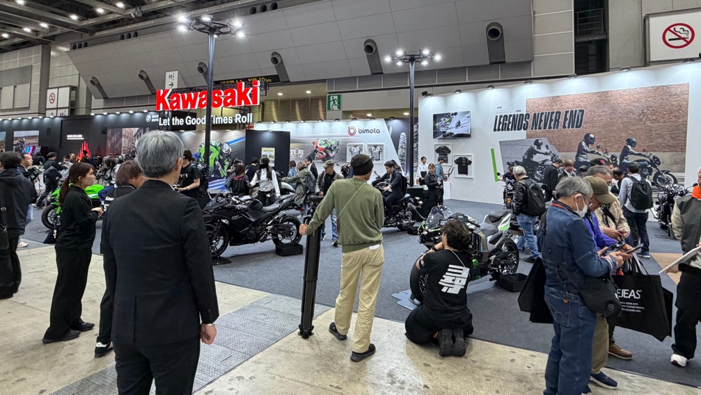カワサキは「乗るカワサキ」「着るカワサキ」をテーマに、新型モデルの展示や跨り体験、アパレル販売を組み合わせて、ブランドの世界観を総合的に体感できる構成とした。カワサキの新型主力モデル「Z900RS」「Z1100SE」「Ninja ZX-10R」「Ninja500」をはじめとする各セグメントの魅力あるモデルを跨って確かめられるようにした。カワサキプラザアパレルコーナーも設けウェアやグッズを販売。さらに、カワサキエンジンを搭載する伊グループメーカーのbimotaの最新モデル「KB998 Rimini」「TESI H2 TERA」などを披露した。