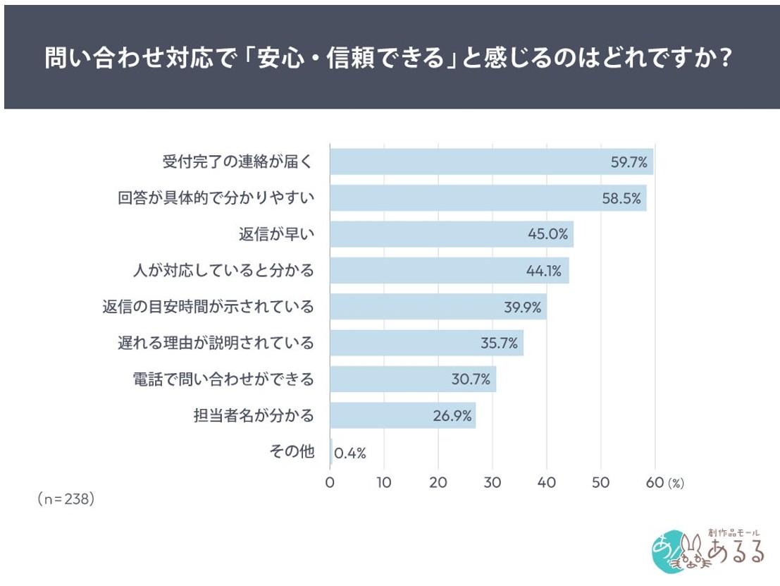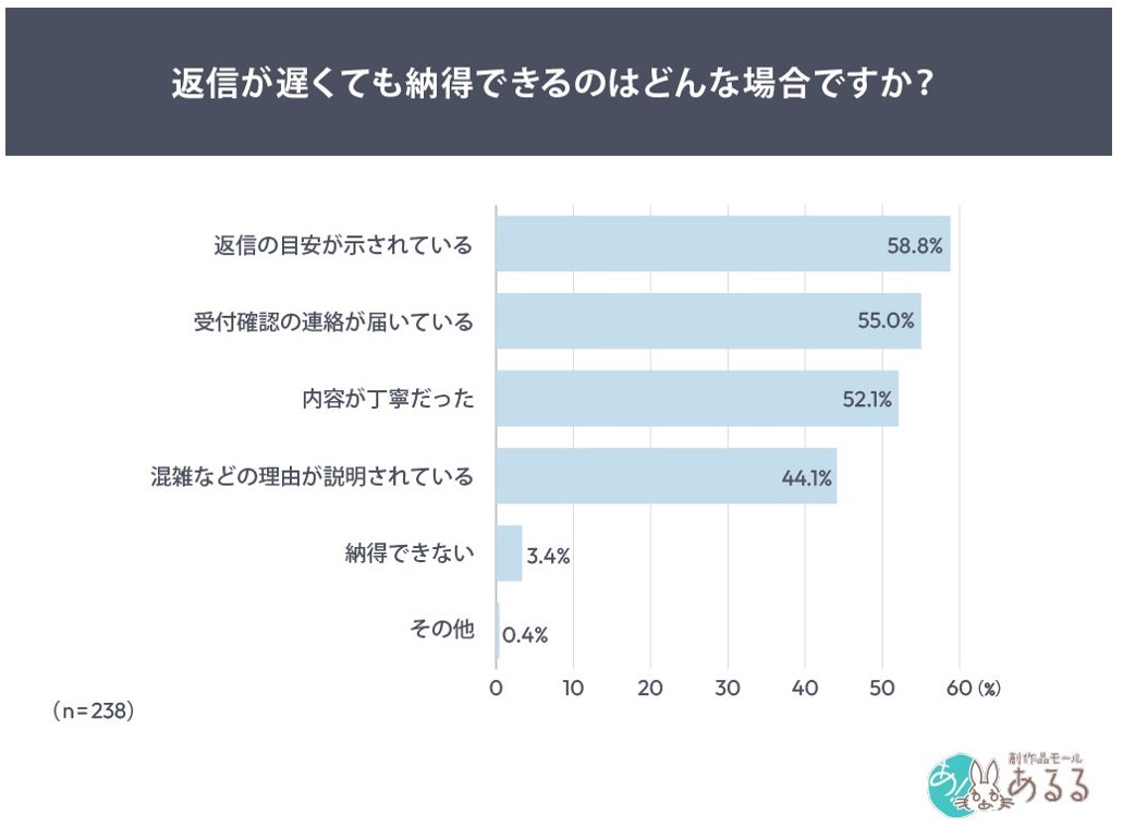 さらに「返信が遅くても納得できる条件」としては、「返信の目安が示されている」が58.8%で、「受付確認の連絡が届いている」は55.0%が上位に挙げられるとしており、沈黙が信頼を揺らすとしている。単に早く返信すること以上に「受付されている」「いつ返信されるか分かる」といった“見通しの共有”が安心感に直結するという。
