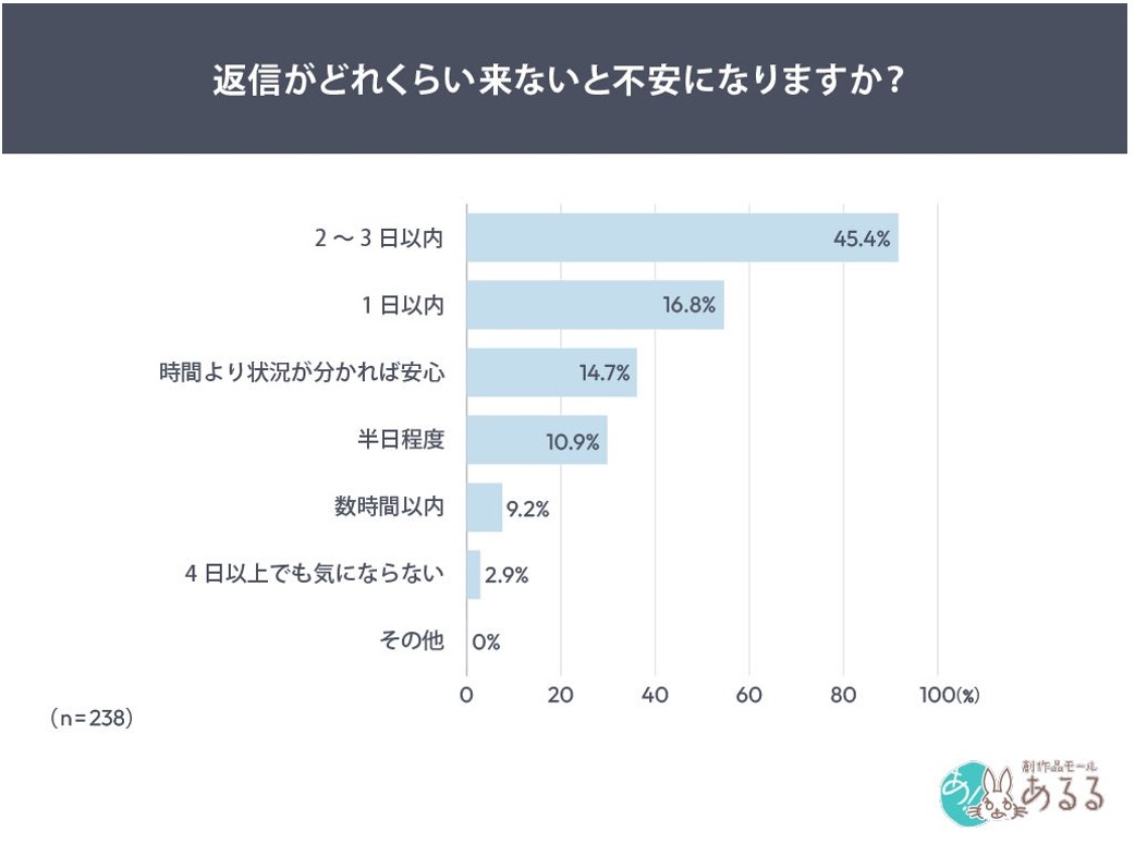 次に「返信がどれくらい来ないと不安になるか」の質問では、「2〜3日以内」と答えた者の割合は45.4%で最多となった一方で、「日数より状況が分かれば安心」が14.7%という回答も一定数見られ。単に時間が経過することよりも「何も連絡がない状態」が続くことが、不安を強めている可能性が高く、2〜3日が“不安の分岐点”としている。