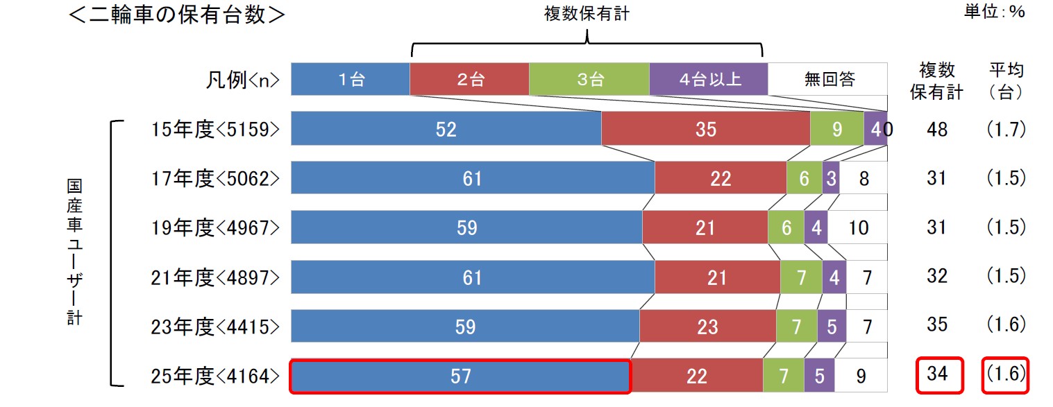 「二輪車の購入・使用行動と意識」について、購買行動や使用状況、今後の意向について詳細に調査している。買い替えや増車の割合は「微増」傾向。「買い替え」は53%、「増車」は17%であった。使用頻度は「週3.2日」、月間走行距離は「約229km」。 大排気量モデルの「使用頻度が高い」結果であった。