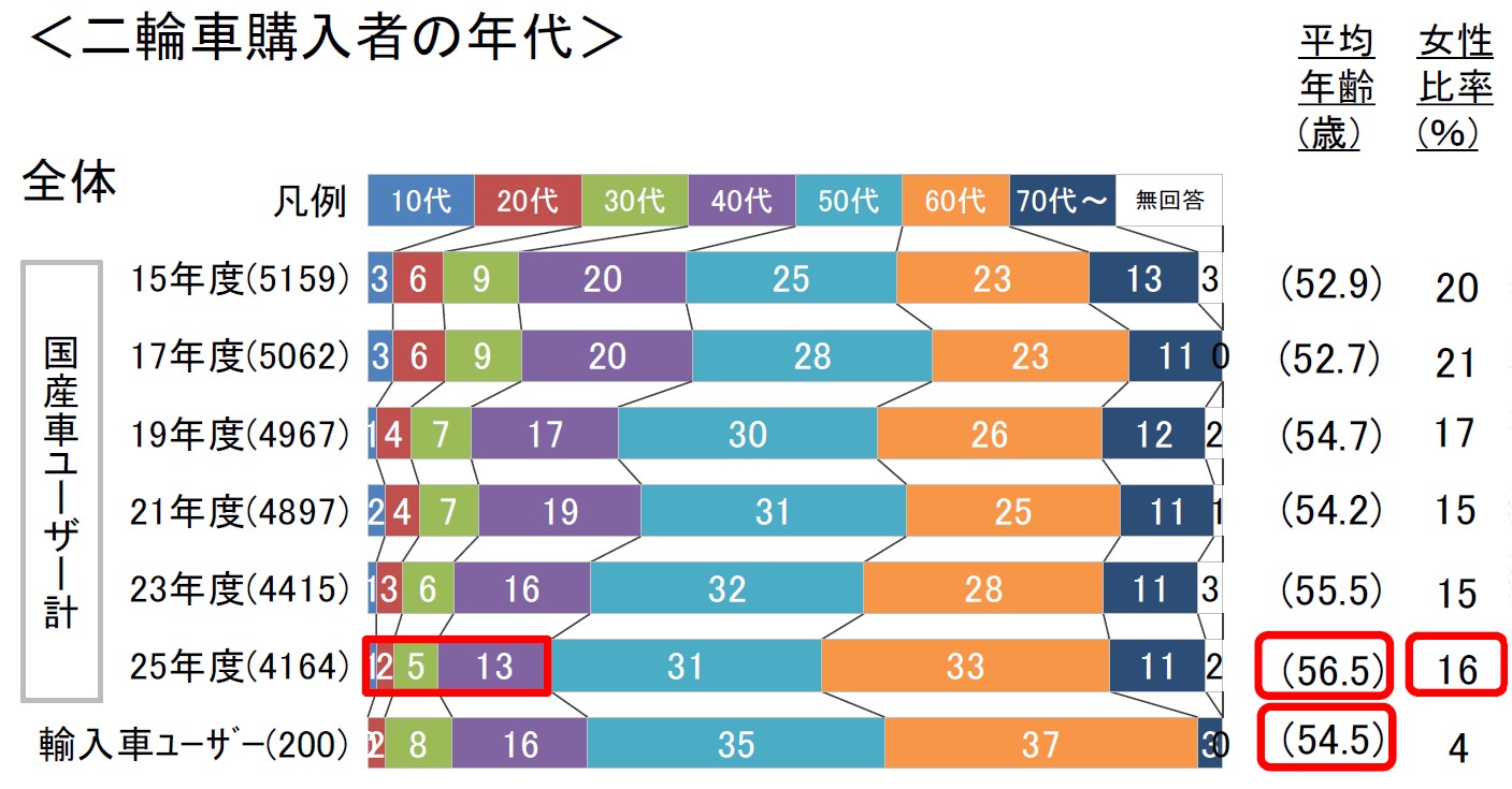 日本自動車工業会(自工会)が「2025年度 二輪車市場動向調査報告書」を公開した。調査は国産二輪車新車購入者の属性、需要構造、購入・使用の実態など調査し、今後の市場動向を把握や二輪車需要の維持と拡大向けた取り組みの検討材料にしていくものとしている。調査は2025年8月29日~同年9月24日の期間に、郵送での書面とインターネットでの有効回答数4164を集計したもの。