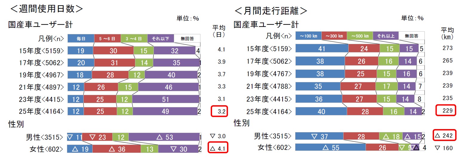 「使用状況と用途」では、二輪車の実態と用途は多様で、全体では「買い物・用足し」「ツーリング」「街乗り」が主要用途となる。男性は「ツーリング」「街乗り」「レジャー」が高く、女性は「買い物・用足し」「通勤・通学」が高い。原付二種やオンロード車は用途により「ツーリング」や「近場の趣味・レジャー」が多い。輸入車も「ツーリング」が人気。スクーターは日常用途、排気量の大きいオンロード車は非日常のツーリングに使われるケースが高い。平均週間使用日数は3.2日、月間走行距離は229kmで、女性の方が使用日数は多かった。