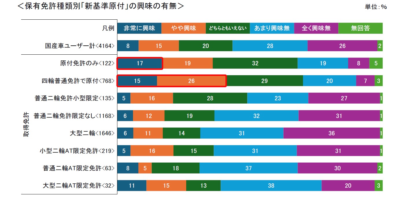 「新基準原付については、原付免許保有者の関心が高く、「新基準原付」に対する興味の有無を免許種類別で見ると「原付免許」「四輪普通免許で原付」での興味関心度が高い。自身が保有する免許の基準変更ということから関心が高いと推察している。新基準原付の購入検討の意向率で「すぐに購入を検討したい」「近いうちに購入を検討したい」を合わせると、全体の10%にすぎない。一方で、属性別では、ビジネス原付第一種の「すぐに検討」の意向が高いほか、輸入車ユーザーや非ユーザーで「近いうちに検討」の意向が高いことが分かった。