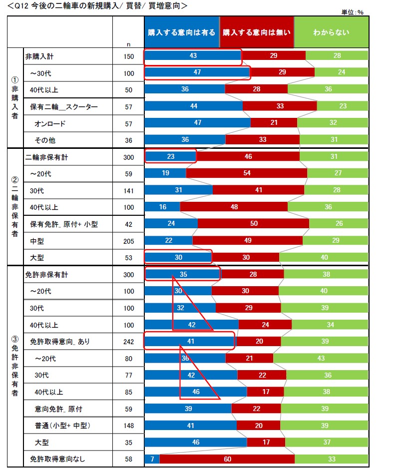 二輪車に対する購入検討意向は高く、特に40歳以上では49%、免許非保有者の41%が購入を検討している。