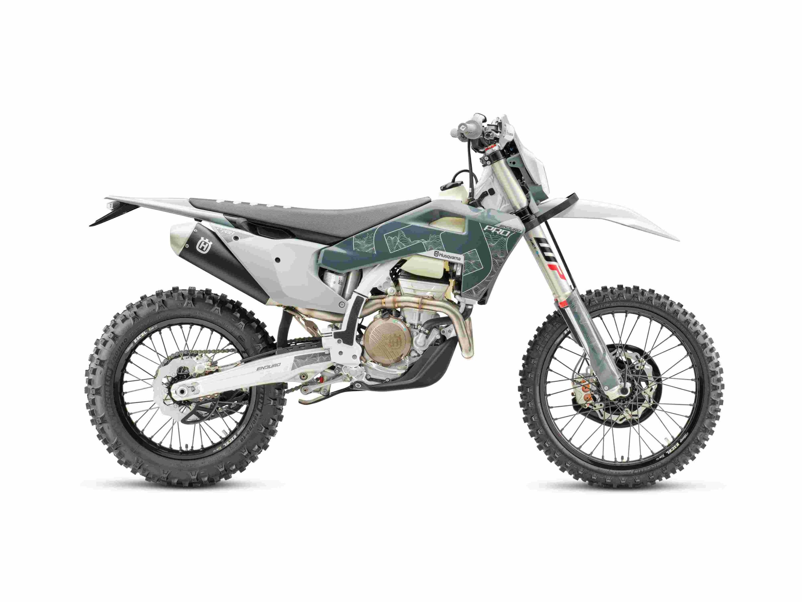 FE350 Proは、ホワイトフレームとグレーを基調としたボディワークを採用したエンデューロモデル。耐久性と走行性能を高める各種テクニカルアクセサリーを標準装備している。