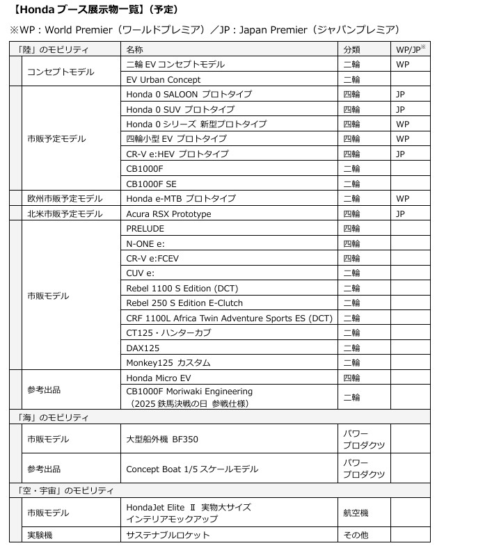 ホンダは一般公開日の10月31日~11月9日に行われる「Japan Mobility Show 2025(ジャパンモビリティショー)」で二輪車・四輪車・パワープロダクツ・航空機など、さまざまなモビリティとその関連技術、コンセプトモデルを出展する。