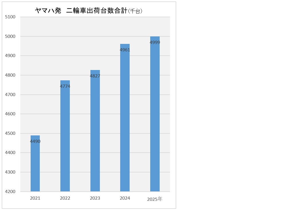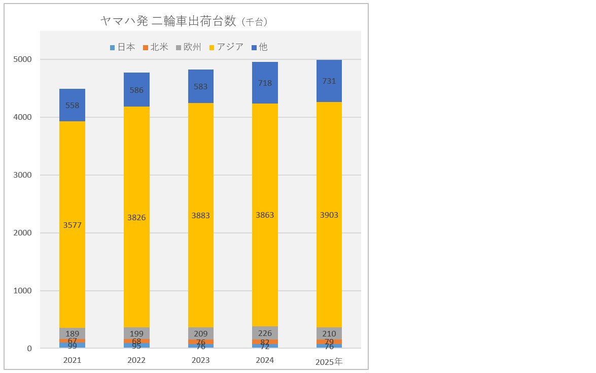 2025年の二輪車の世界市場での販売台数は、前年度496万1000台に比べ微増の499万9000台であった。このうち日本が前年度7万2000台であったが2025年は7万6000台に増加、北米が同8万2000台であったが2025年は7万9000台、欧州は同22万6000台が21万台、アジアは同386万3000台であったが2025年は390万3000台、その他は同71万8000台が2025年は73万1000台であった。