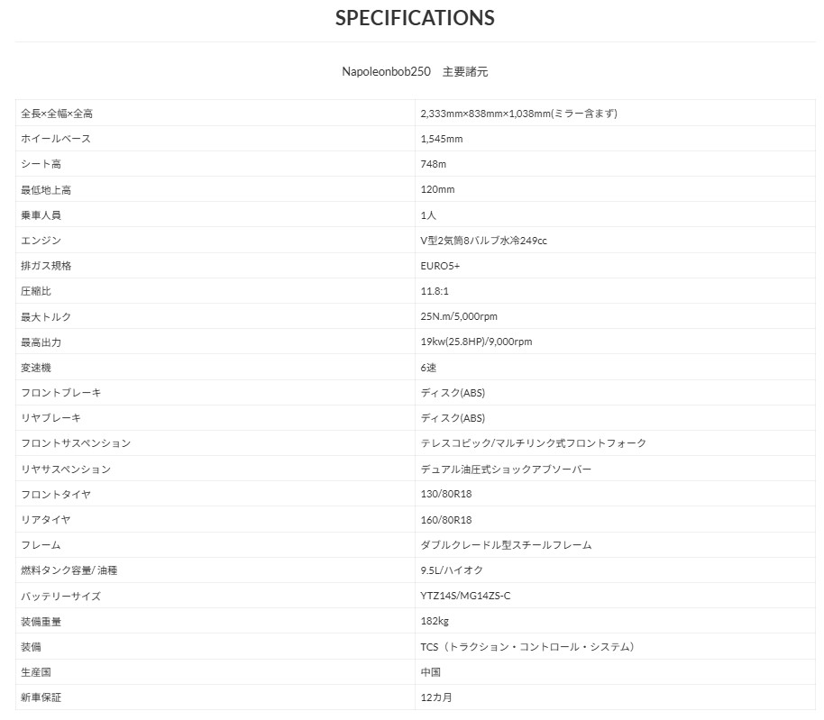 ウイングフット株式会社(東京都足立区/上昭稔・社長)は、中国・杭州の杭州サターンパワーテクノロジー株式会社のモーターサイクルブランド「BENDA」(ベンダ)の取り扱いを開始。手始めにネオクラシックのクルーザータイプ特徴的なデザインの250ccクラス「Naporeonbob250」(ナポレオンボブ250)」を発売した。