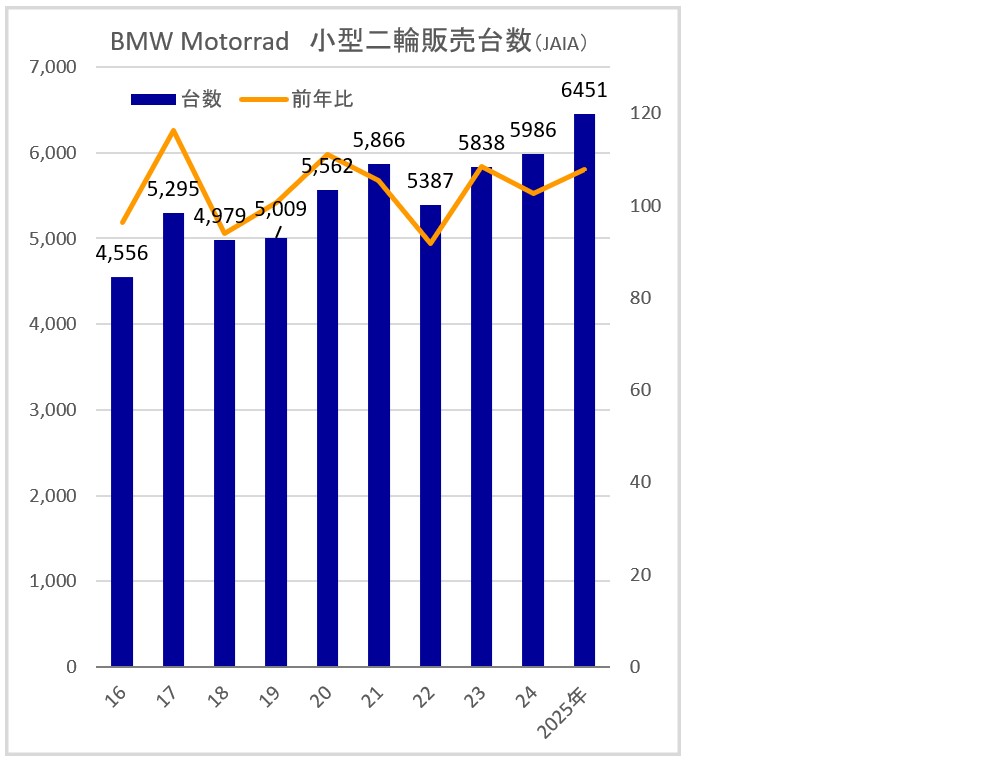 BMW Motorradは2025年における251㏄超の小型二輪の新規登録台数が6451台となり、2010年7月の統計開始以来、史上最高を記録したとしている。前年の2024年は5986台で、年間6000台を若干割ったが、2025年は対前年比7.8%上回る販売をみせた。BMW Motorrad正規ディーラーは全国に70拠点で、一店舗あたりの平均販売台数は92台となる。